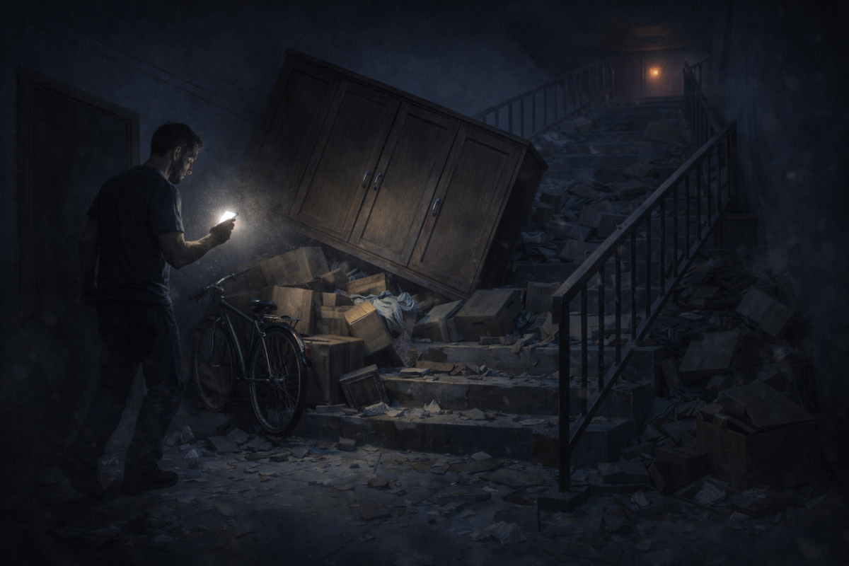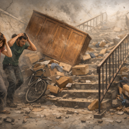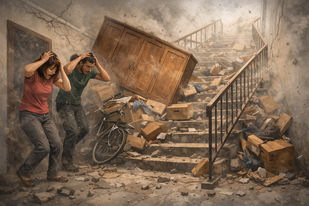 Med potresom predmeti, odloženi na hodnikih in stopniščih, izgubijo stabilnost ter se lahko prevrnejo ali raztresejo po evakuacijski poti. Tresenje povzroči premikanje tudi na videz trdno postavljenih omar, ki lahko ogrozijo stanovalce v njihovi bližini. Po potresu je pogosto prisotna panika, saj želijo stanovalci objekt zapustiti v čim krajšem času. Če so hodniki in stopnišča delno ali v celoti zablokirani s prevrnjenimi predmeti, se poveča tveganje za padce, poškodbe in verižne nesreče, pri katerih padec ene osebe ogrozi tudi druge.