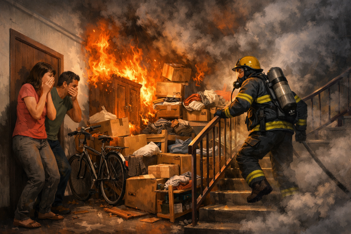 Predmeti, ki so postavljeni na hodnikih in zožujejo evakuacijsko pot, niso zgolj mehanska ovira v izrednih razmerah, temveč lahko predstavljajo resno nevarnost. Gorljivi materiali, kot so les, iverne plošče, tekstil in plastika, povečujejo požarno obremenitev objekta in lahko omogočijo širjenje požara na skupne hodnike. Zato je ključnega pomena, da so skupni hodniki in stopnišča čim bolj prazni, saj se s tem preventivno zagotovi varna evakuacija vseh uporabnikov, kadar je to potrebno. Če zaznate dim na skupnem hodniku ali stopnišču in nimate druge proste evakuacijske poti, ostanite mirni ter prostora ne zapuščajte, če niste v neposredni nevarnosti. Počakajte na gasilce.